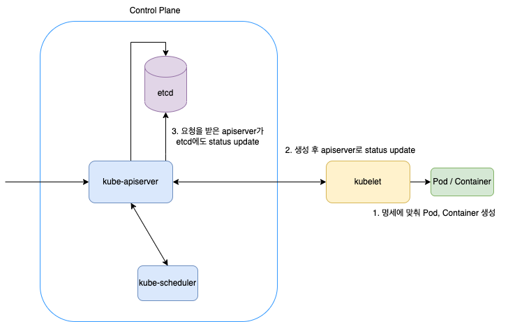 합쳐서 정리하자면 중간중간 바뀌는 명세는 지속적으로 etcd에 업데이트되는 것이고, 각 컴포넌트간 순서, 역할에 맞게 동작하며 Pod가 띄워지는 것