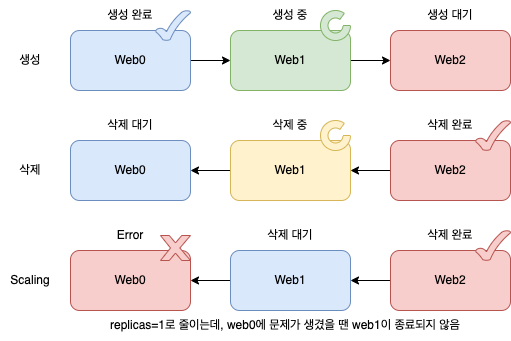 - Scaling이 될때는 앞선 Pod가 Running or Ready state일때 진행 됨