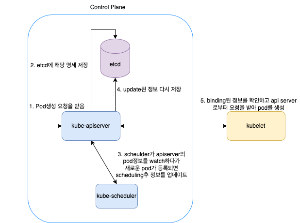 그림에 적은 것 처럼 순서대로 진행이 되고 pod생성 요청을 각 node에 띄워져있는 kubelet으로 보냄